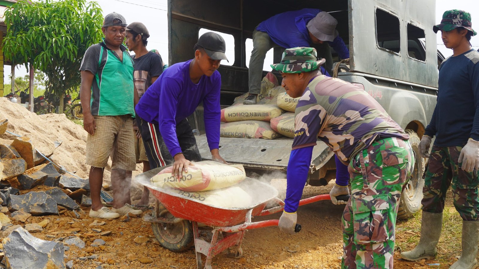 Kegiatan penurunan material tersebut dilakukan secara gotong royong oleh personel Satgas TMMD bersama warga setempat. Material semen ini nantinya akan digunakan untuk mendukung pengerjaan sasaran fisik berupa siring badan jalan yang menjadi salah satu program utama TMMD ke-127 di wilayah tersebut.