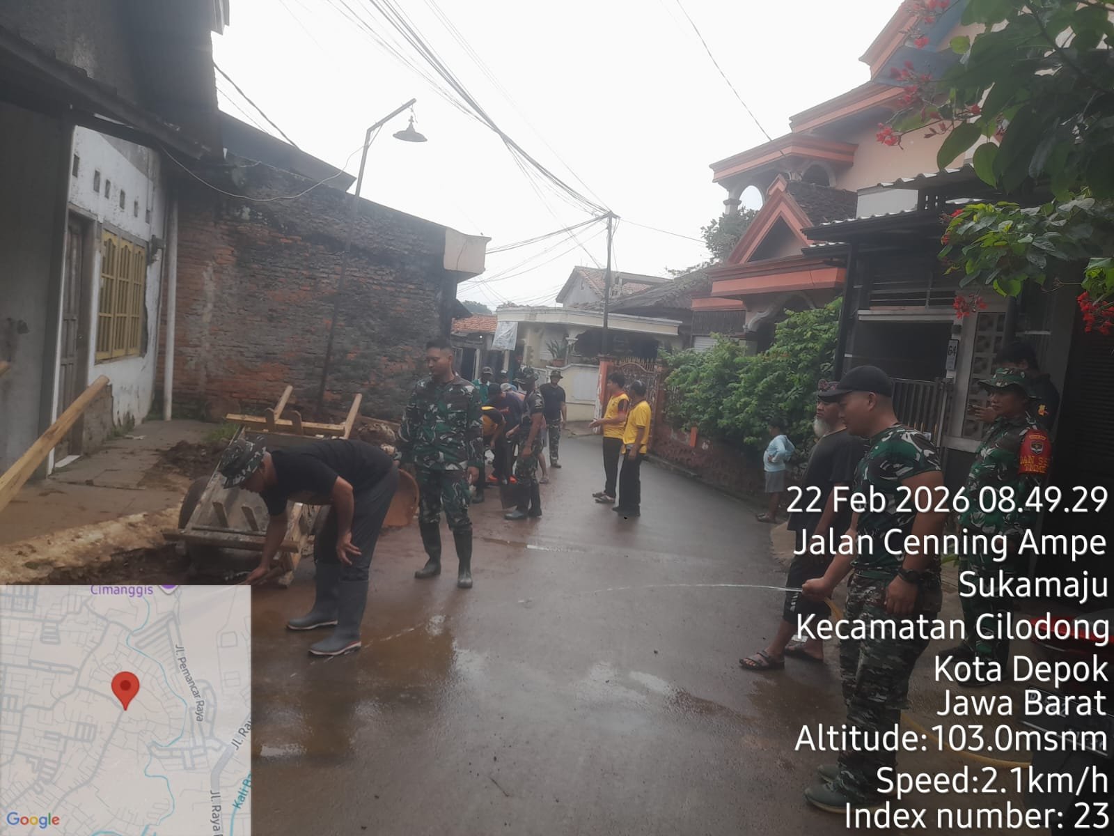 Meski sejak pagi diguyur gerimis dan cuaca mendung hingga sore, pekerjaan tetap berjalan lancar. Sebanyak 89 personel TNI AD diterjunkan, didukung unsur TNI AL, TNI AU, Polri, Pemda, perangkat desa, serta masyarakat setempat yang bahu-membahu di lokasi.