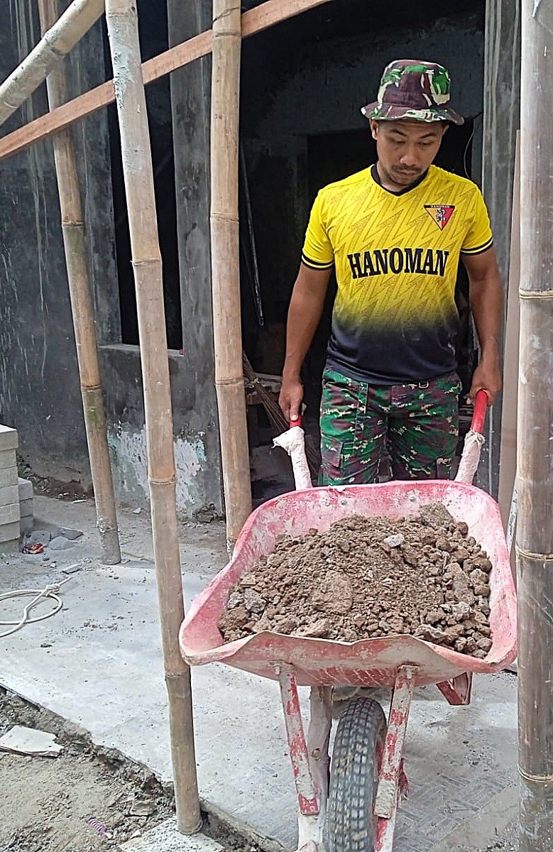 Personel Satgas TMMD bersama masyarakat bekerja secara gotong royong menggunakan peralatan pertukangan dan dukungan logistik yang tersedia.